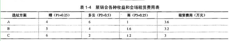某网络公司为了扩大华北市场,希望在北京举行一个展销会,会址打算选择在北京市内的A、B、C 3个会场之一。获利情况与天气有关。通过天气预报了解到展销会当日天气为晴、多云和雨的概率,收益和会场租赁费用情况如表1-4所示,那么该公司的决策是( )。A.选择A会场B.选择B会场C.选择C会场D.难以选择会场
