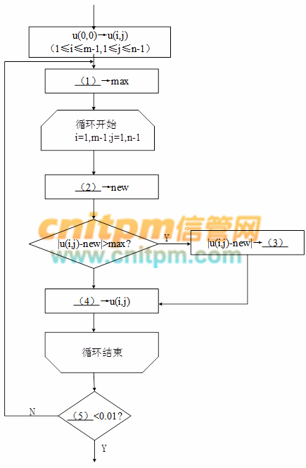 根据调和函数的特点可以推导出近似算式:该矩形内任一网格点上的函数值等于其上下左右四个相邻网格点上函数值的算术平均值。这样,我们就可以用法代法来进行数值计算了。首先将该矩形内部所有网格点上的函数值设置为一个常数,例如 u(0,0); 然后通过该法代式计算矩形内各网格点上的新值。这样反复进行法代计算,若某次迭代后所 有的新值与原值之差别都小于预定的要求(如0.01),则结束求解过程。