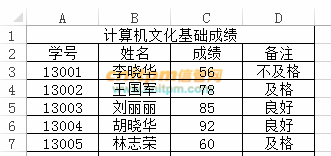用 Excel 制作的学生计算机文化基础课程成绩表如下。当学生成绩小于 60分,需要 在对应的备注栏填"不及格";若学生成绩大于 59 分,小于 79,需要在对应的备注栏填 "及格",否则在对应的备注栏填 “良好”。实现时,可在 D3 单元格输入 “=IF((1),“不及格”,(2) ))”,并向下拖动填充柄至 D7 单元格即可。