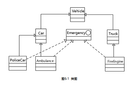 某应急交通控制系统(TraficControlSystem)在红灯时控制各类车辆 (Vehicle)的通行,其类图如图6-1所示,在紧急状态下应急车辆在红灯时可通行,其余车辆按正常规则通行。