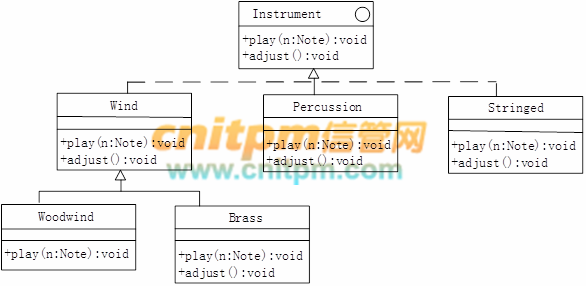 对部分乐器进行建模,其类图如图5-1所示,包括:乐器(Instrument)、管乐器(Wind)、打击乐器(Percussion)、弦乐器(Stringed)、木管乐器(Woodwind)、铜管乐器(Brass)。