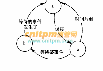 进程的三态模型如下图所 示,其中的 a、b 和 c 处应分别填写( )。