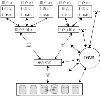 从数据库管理系统的角度看,数据库系统一般采用三级模式结构,如下图所示。