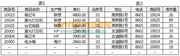 某超市的商品(商品号,商品名称,生产商,单价)和仓库(仓库号,地址,电话,商品号,库存量)两个基本关系如表1和表2所示。