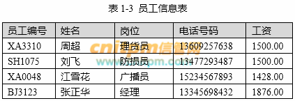 3. 每个部门雇用了多名员工处理日常事务,每名员工只能属于一个部门(新进员工在培训期不隶属于任何部门)。员工需要记录的信息包括员工编号、姓名、岗位、电话号码和工资。员工信息如表1-3所示。