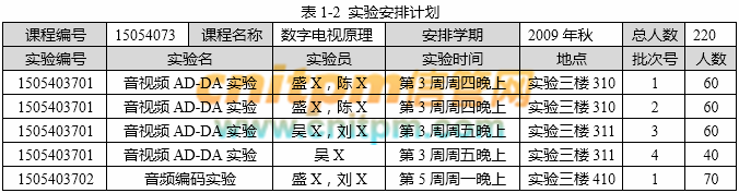 (2)以课程为单位制定实验安排计划信息,包括:实验地点,实验时间、实验员等信息,实验计划如表1-2所示。