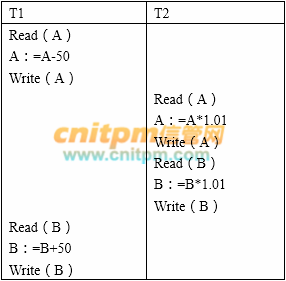 假设当前帐户A余额为100元,帐户B余额为200元。有两个事务分别为T1 (A,B,50),T2,一种可能的串行执行为:
