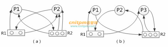 进程资源图(a)和(b)所示,其中:图(a)中(1);图(b)中(2)。