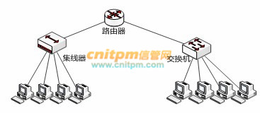 网络配置如图所示,其中使用了一台路由器、一台交换机和一台集线器,对于这种配置,下面的论断中正确的是( )。A.2个广播域和2个冲突域 B.1个广播域和2个冲突域 C.2个广播域和5个冲突域 D.1个广播域和8个冲突域