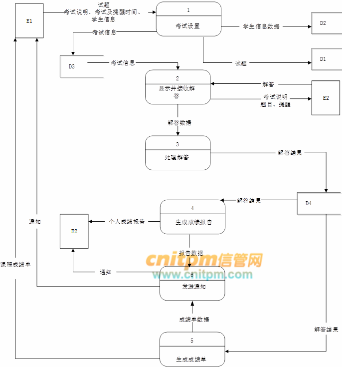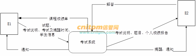 现采用结构化方法对考试系统进行分析与设计,获得如图1-1所示的上下文数据流图和图1-2所示的0层数据流图。