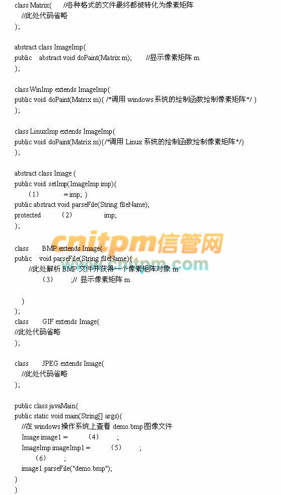 现欲实现一个图像浏览系统,要求该系统能够显示BMP、JPEG 和GIF三种格式的文件,并且能够在Windows和Linux两种操作系统上运行。系统首先将BMP、JPEG 和GIF三种格式的文件解析为像素矩阵,然后将像素矩阵显示在屏幕上。系统需具有较好的扩展性以支持新的文件格式和操作系统。为满足上述需求并减少所需生成的子类数目,采用桥接(Bridge)设计模式进行设计所得类图如图7-1所示