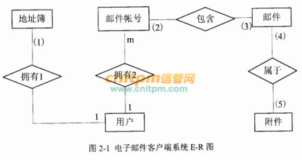根据以上说明设计的E-R图如图2-1所示,请指出地址簿与用户、电子邮件帐号与邮件、邮件与附件之间的联系类型。