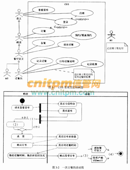 系统采用面向对象方法开发,使用UML进行建模。系统的顶层用例图和一次订餐的活动图初稿分别如图3-1和图3-2所示。