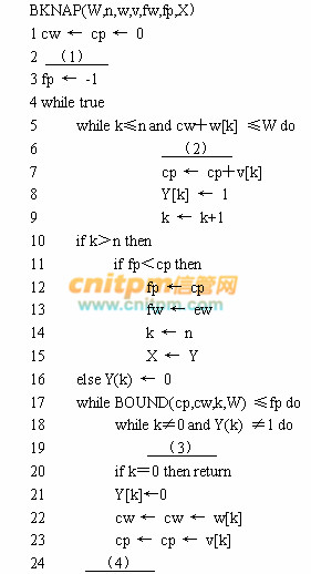 回溯法是一种系统的搜索方法。在确定解空间后,回溯法从根结点开始,按照深度优先策略遍历解空间树,搜索满足约束条件的解。对每一个当前结点,若扩展该结点己经不满足约束条件,则不再继续扩展。为了进一步提高算法的搜索效率,往往需要设计一个限界函数,判断并剪枝那些即使扩展了也不能得到最优解的结点。现在假设已经设计了BOUND(v,w,k,W)函数,其中v, w, k和W分别表示当前已经获得的价值、当前背包的重量、己经确定是否选择的物品数和背包的总容量。对应于搜索树中的某个结点,该函数值表示确定了部分物品是否选择之后,对剩下的物品在满足约束条件的前提下进行选择可能获得的最大价值,若该价值小于等于当前已经得到的最优解,则该结点无需再扩展。