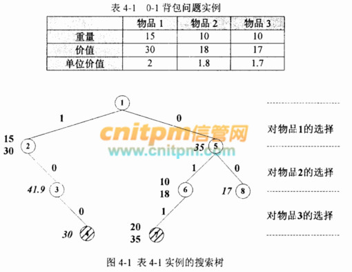 考虑表4-1的实例,假设有3个物品,背包容量为22。图4-1中是根据上述算法构造的搜索树,其中结点的编号表示了搜索树生成的顺序,边上的数字1/0分别表示选择/不选择对应物品。除了根结点之外,每个左孩子结点旁边的上下两个数字分别表示当前背包的重量和已获得的价值,右孩子结点旁边的数字表示扩展了该结点后最多可能获得的价值。为获得最优解,应该选择物品 (5) ,获得的价值为 (6) 。