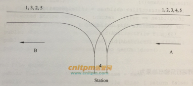 现有n(n<1000)节火车车厢,顺序编号为1,2,3,„,n,按编号连续依次从A方向的铁轨驶入,从B方向铁轨驶出,一旦车厢进入车站(Station)就不能再回到A方向的铁轨上;一旦车厢驶入B方向铁轨就不能再回到车站,如图7-1所示,其中Station为栈结构,初始为空且最多能停放1000节车厢。