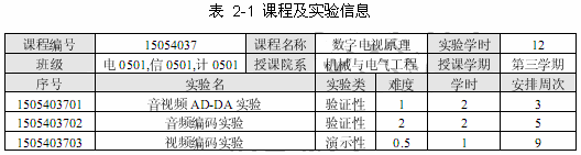 (1)课程信息包括:课程编号、课程名称、实验学时、授课学期和开课的班级等信息;实验信息记录该课程的实验进度信息,包括:实验名、实验类型、学时、安排周次等信息,如表2-1所示。