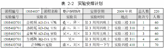 (2)以课程为单位制定实验安排计划信息,包括:实验地点,实验时间、实验员等信息,实验计划如表2-2所示。