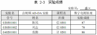 (3)由实验员给出每个学生每次实验的成绩,包括:实验名、学号、姓名、班级、实验成绩等信息,实验成绩如表2-3所示。