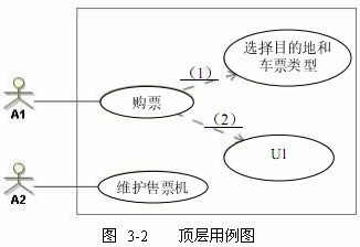 根据说明中的描述,给出图3-2中A1和A2所对应的参与者,U1所对应的用例,以及(1)、(2)处所对应的关系。