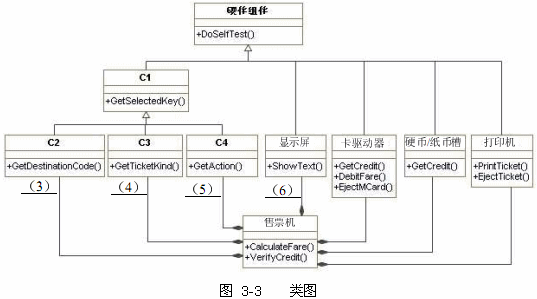 根据说明中的描述,给出图3-3中缺少的C1~C4所对应的类名以及(3)~(6)处所对应的多重度。