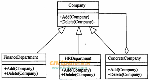 其中Company为抽象类,定义了在组织结构图上添加(Add)和删除(Delete)分公司/办事处或者部门的方法接口。类ConcreteCompany表示具体的分公司或者办事处,分公司或办事处下可以设置不同的部门。类HRDepartment和FinanceDepartment分别表示人力资源部和财务部。