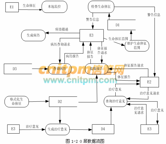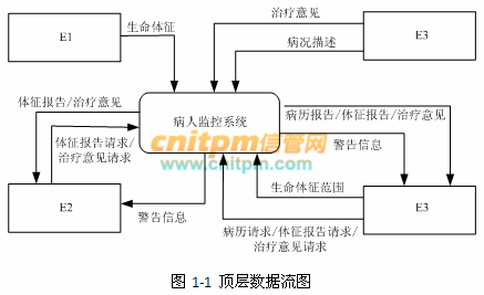 现采用结构化方法对病人监控系统进行分析与设计,获得如图1-1所示的顶层数据流图和图1-2所示的0层数据流图。