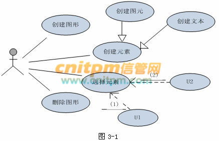 根据说明中的描述,给出图3-1中U1和U2所对应的用例,以及(1)和(2)处所对应的关系。