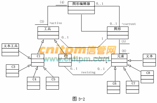 根据说明中的描述,给出图3.2中缺少的C1~C8所对应的类名以及(3)~(6)处所对应的多重度。