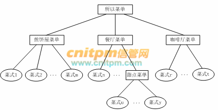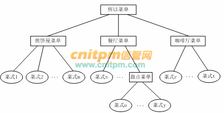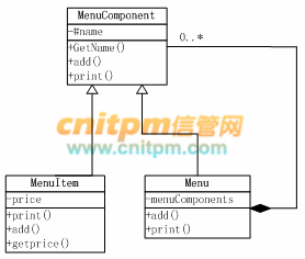 现在采用组合( Composition)模式来构造该饭店的菜单,使得饭店可以方便地在其中增加新的餐饮形式,得到如下图所示的类图。其中MenuComponent为抽象类,定义了添加(add)新菜单和打印饭店所有菜单信息(print)的方法接口。类Menu表示饭店提供的每种餐饮形式的菜单,如煎饼屋菜单、咖啡屋菜单等。每种菜单中都可以添加子菜单,例如图中的甜点菜单。类Menultem表示菜单中的菜式。