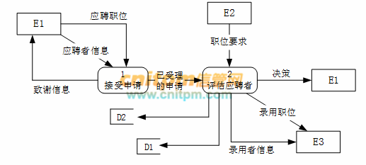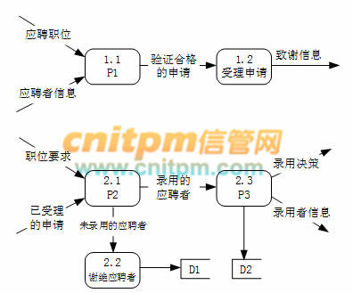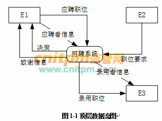 现采用结构化方法对招聘系统进行分析与设计,获得如图1-1所示的顶层数据流图、图1-2所示0层数据流图和图1-3所示1层数据流图。
