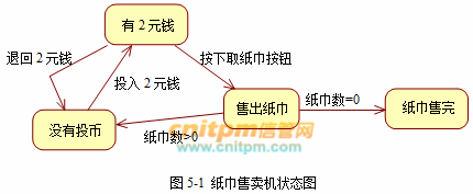 某大型商场内安装了多个简易的纸巾售卖机,自动出售2元钱一包的纸巾,且每次仅售出一包纸巾。纸巾售卖机的状态图如图5-1所示。