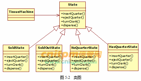 采用状态(State)模式来实现该纸巾售卖机,得到如图5-2所示的类图。其中类State为抽象类,定义了投币、退币、出纸巾等方法接口。类SoldState、SoldOutState、NoQuarterState和HasQuarterState分别对应图5-1中纸巾售卖机的4种状态:售出纸巾、纸巾售完、没有投币、有2元钱。