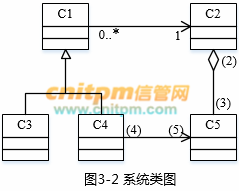 根据说明中的描述,给出图3-2中C1~C5所对应的类名(表3-1中给出的类名)和(2)~(5)处所对应的多重度。