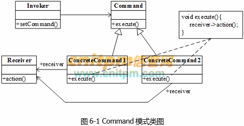 某灯具厂商欲生产一个灯具遥控器,该遥控器具有7个可编程的插槽,每个插槽都有开关灯具的开关,现采用Command(命令)模式实现该遥控器的软件部分。Command模式的类图如图1-1所示。