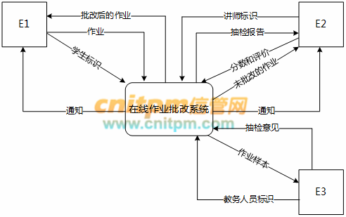 现采用结构化方法对在线作业批改系统进行分析与设计,获得如图1-1所示的上下文数据流图和图1-2所示的0层数据流图。