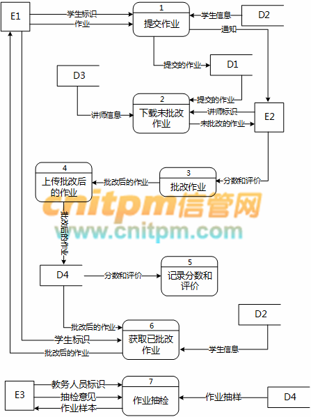 (1)提交作业。验证学生标识后,学生将电子作业通过在线的方式提交,并进行存储。系统给学生发送通知表明提交成功,通知中包含唯一编号;并通知讲师有作业提交。