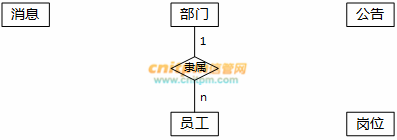 (4)公告信息包括:编号、标题、名称、内容、发布部门、发布时间。其中编号唯一确定公告关系的每二个元组。一份公告对应一个发布部门,但一个部门可以发布多份公告;一份公告可以被多名员工阅读,一名员工可以阅读多份公告。