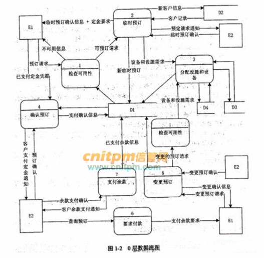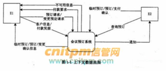 现采用结构化方法对会议预定系统进行分析与设计,获得如图1-1所示的上下文数据流图和图1-2所示的0层数据流图(不完整)