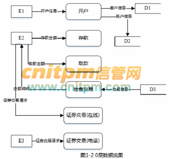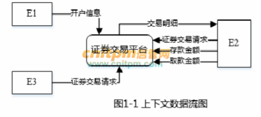 (5)检查交易。平台从交易记录中读取交易信息,将交易明细返回给客户。 现采用结构化方法对该证券交易平台进行分析与设计,获得如图1-1所示的上下文数据流图和图1-2所示的0层数据流图。