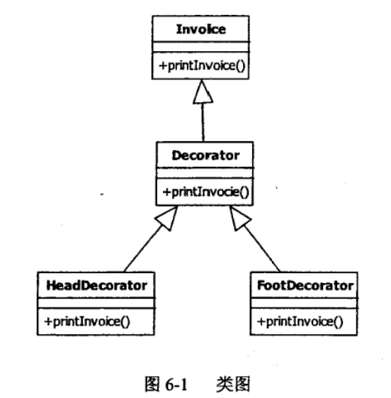 某发票(lnvoice)由抬头(Head)部分、正文部分和脚注(Foot)部分构成。现采用装饰(Decorator)模式实现打印发票的功能,得到如图6-1所示的类图。