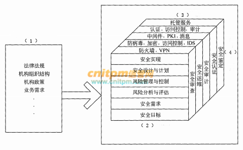 设计源于需求,需求源于目标。要弄清安全的需求,就要首先明确安全的管理目标。一般而言,针对安全的管理目标包括政策需求和业务需求。获取和分析安全需求通常是从国家法律、组织政策、业务策略和责任追究等方西出发,而这些都是系统管理层需要考虑的内容。安全信息系统构建的最终目标,就是要求通过多层次手段最终所实现的信息系统完全满足管理层的要求。