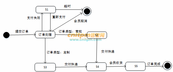 根据订单处理过程的描述,在图 3-2 中S1~S5处分别填入对应的状态名称。