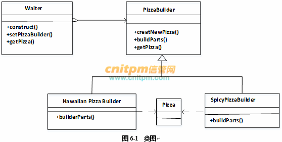 某快餐厅主要制作并出售儿童套餐,一般包括主餐(各类比萨)、饮料和玩具,其餐品种类可能不同,但其制作过程相同。前台服务员 (Waiter) 调度厨师制作套餐。现采用生成器 (Builder) 模式实现制作过程,得到如图 6-1 所示的类图。