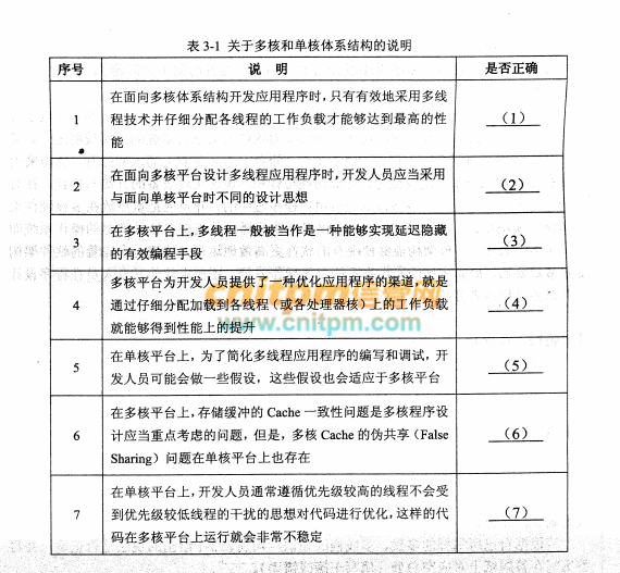 请根据自己所掌握的多核、多线程的知识,判别表 3-1给出的说法是否正确,并将答案写在答题纸上对应空白处(填写正确或错误)。