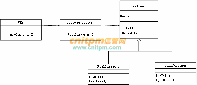 以下Java代码实现一个简单客户关系管理系统(CRM)中通过工厂(CustomerFactory )对象来创建客户(Customer)对象的功能。客户分为创建成功的客户(RealCustomer)和空客户 (NullCustomer)。空客户对象是当不满足特定条件时创建或获取的对象。类间关系如图 5-1 所示。