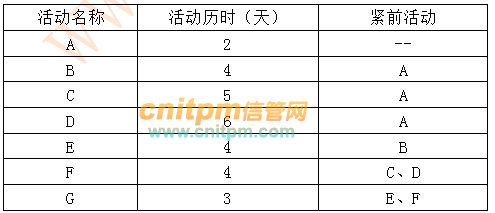 某项目包含A.B.C.D.E.F.G七个活动,各活动的历时估算和活动间的逻辑关系如下表所示,活动C的总浮动时间是(1)天,该项目工期是(2)天。(1)A、0B、1C、2D、3(2)A、13B、14C、15D、16