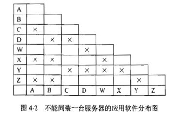 有8套计算机应用软件A、B、C、D、W、X、Y、Z要进行系统集成安装。虽然每套应用软件占用的存储空间不大,但部分应用软件调用操作系统底层相同的动态链接库(DLL),出于安全考虑,某些应用软件不能安装在同一台服务器上。在图4-2中,符号“x”表示相应的两套计算机应用软件不能安装在同一台服务器上。那么这8套应用软件至少需要安装在(1)台服务器上,实现这种最少服务器台数的系统集成方案(不计各软件安装顺序)可有(2)个。