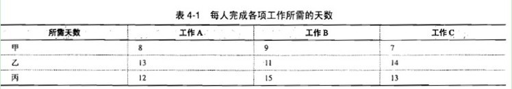某公司准备将3项工作A、B、C分配给网络工程师甲、乙、丙3人,每人分别做一项。估计每人完成各项工作所需的天数如表4-1所示。为使完成这3项工作所需的总天数最少,应选最优的分配方案。在最优分配方案中,( ).A.甲做工作AB.乙做工作AC.丙做工作BD.甲做工作C