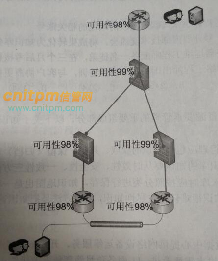 下图是某数据中心网络结构示意图,图中网络的可用性是()(0.98*0.99=0.97,0.98*0.98=0.96)。
